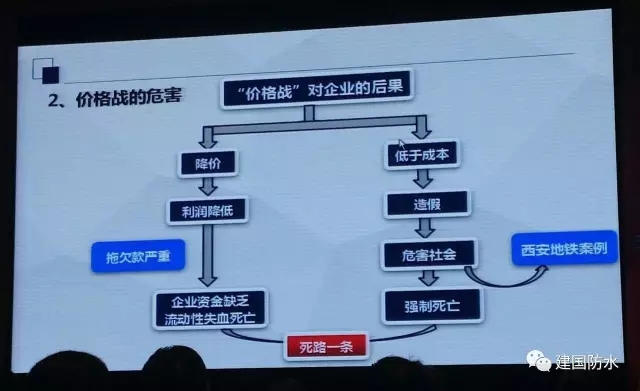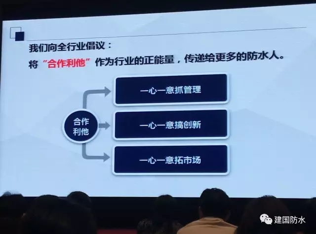 楊理事長主要就三個大家較為關(guān)注的行業(yè)問題進(jìn)行分析講解,他著重強(qiáng)調(diào),企業(yè)之間打價格戰(zhàn)最終只能走向“滅亡”,號召企業(yè)要進(jìn)行創(chuàng)新,依靠新產(chǎn)品、新技術(shù)、新管理、新組織、控制原材料等取得利潤,才能使企業(yè)在嚴(yán)峻的市場環(huán)境下穩(wěn)步前行。并且向全行業(yè)倡議,將“合作利他”作為行業(yè)的正能量,傳遞給更多的防水人。